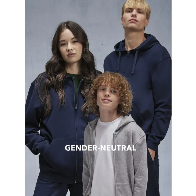 Felpa cappuccio con zip in cotone e poliestere riciclato, modello sostenibile con taglio moderno e spalle scese. Il cappuccio foderato in jersey singolo e la zip integrale offrono praticità. Priva di etichetta, è ideale per la personalizzazione.