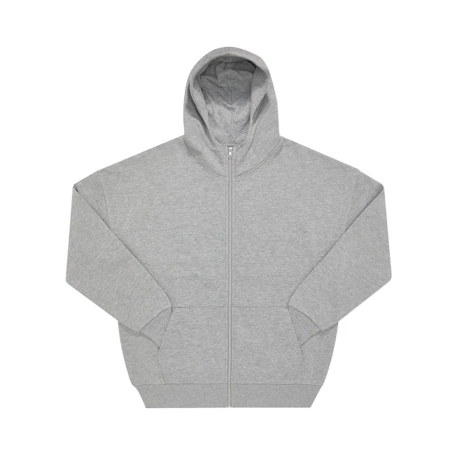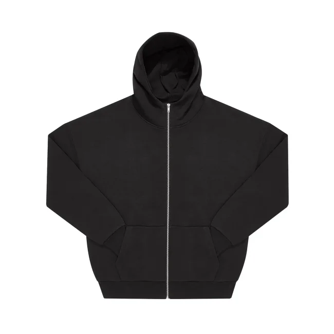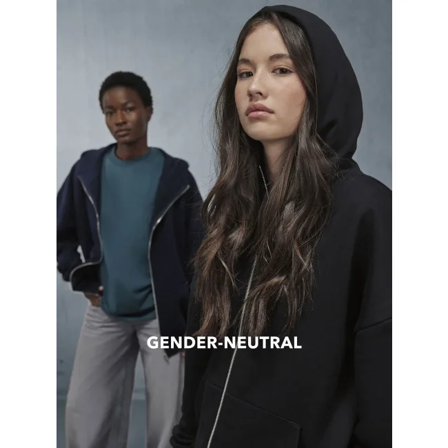 Felpa zip e cappuccio in cotone e poliestere riciclato, con taglio oversize e spalle scese. Il tessuto felpato internamente offre una sensazione lussuosa al tatto. Priva di etichetta, è perfetta per la personalizzazione.