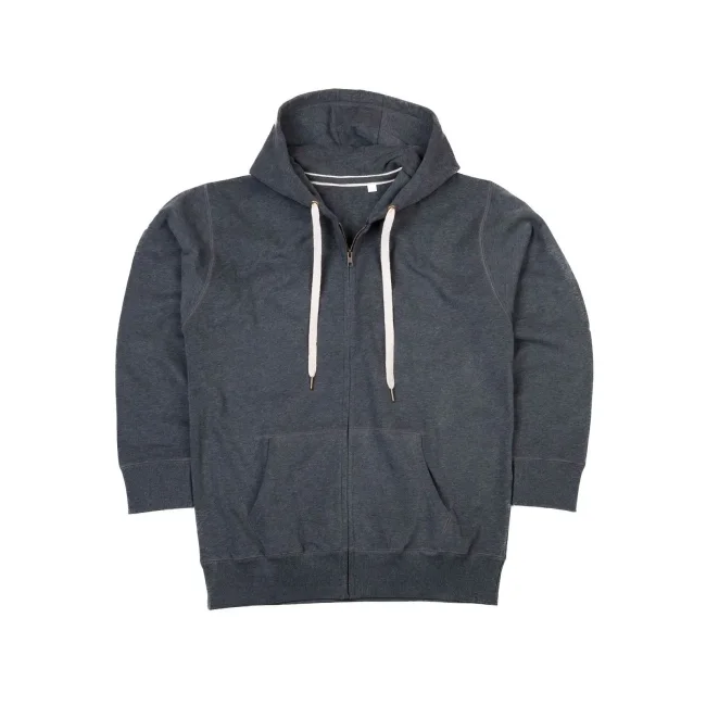 80% cotone 20% poliestere. Felpa con maniche set-in, tasca a marsupio, orlo inferiore e polsini in costina, nastro di rinforzo al collo, cerniera, cappuccio con cordoncino piatto di colore contrastante con occhielli e estremità del cordino ad effetto ottone. Etichetta strappabile, felpata internamente, struttura con cuciture laterali.