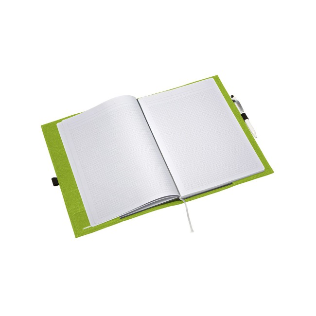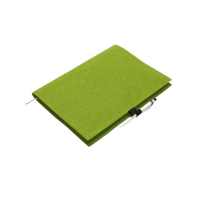 100% feltro. Custodia ideale per quaderni formato A4, portapenna come chiusura. Dimensioni: 24 x 32 x 1 cm, area personalizzabile: 10 x 28 cm sul fronte.