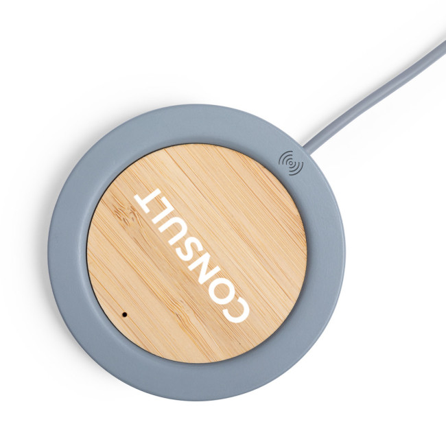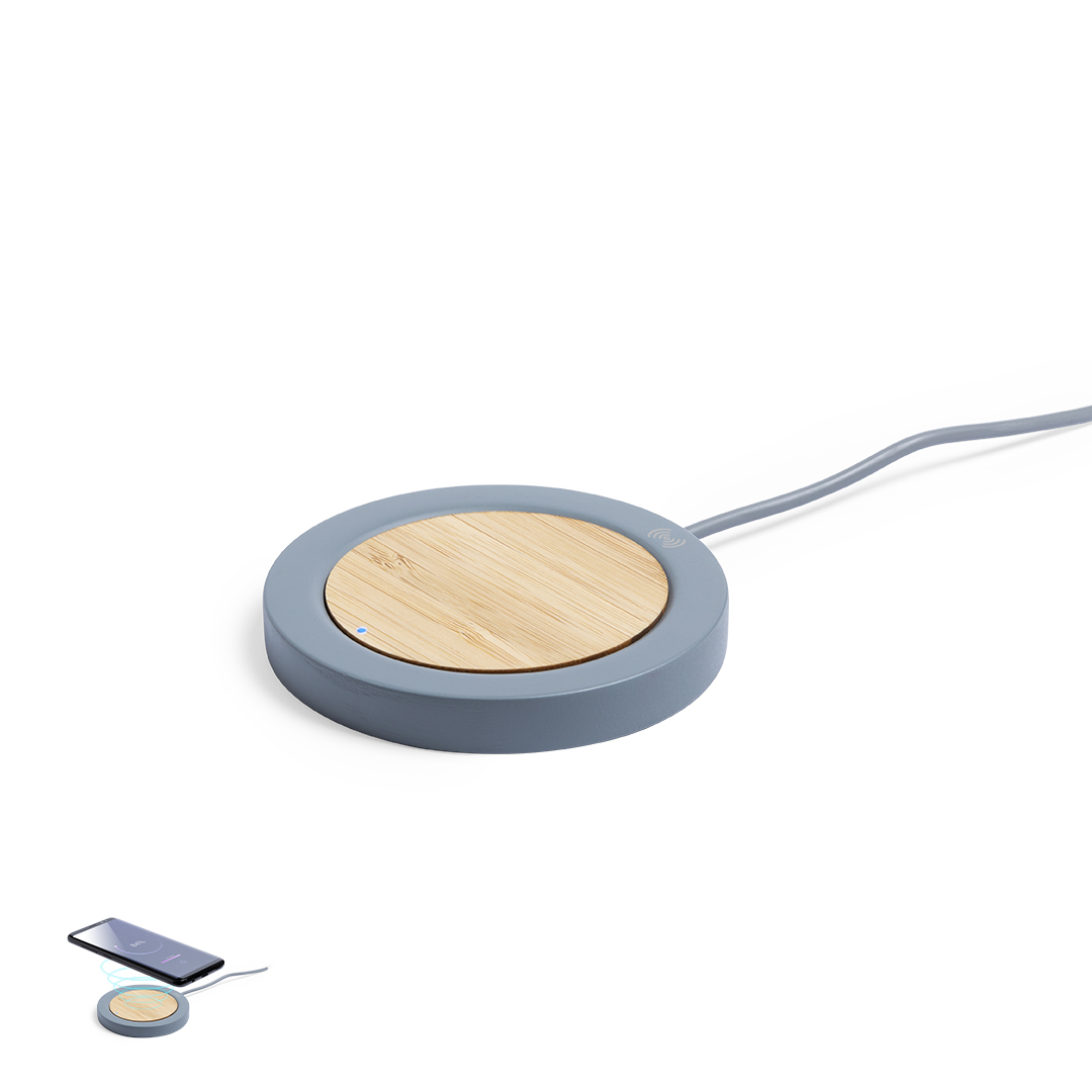 Caricabatterie wireless con un design circolare in combinazione di pezzi di bambù naturale e cemento calcareo, un legante formato da una miscela di materiali naturali, principalmente calcare macinato e acqua, ottenendo un materiale di grande consistenza e durata.Indicatore LED, cavo di ricarica USB abbinato e compatibile con dispositivi dotati di tecnologia di ricarica wireless. Protezione di sicurezza per prevenire surriscaldamento, sovraccarico e cortocircuito. Presentato in un'attraente scatola di design
