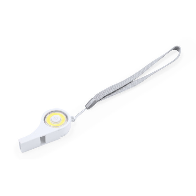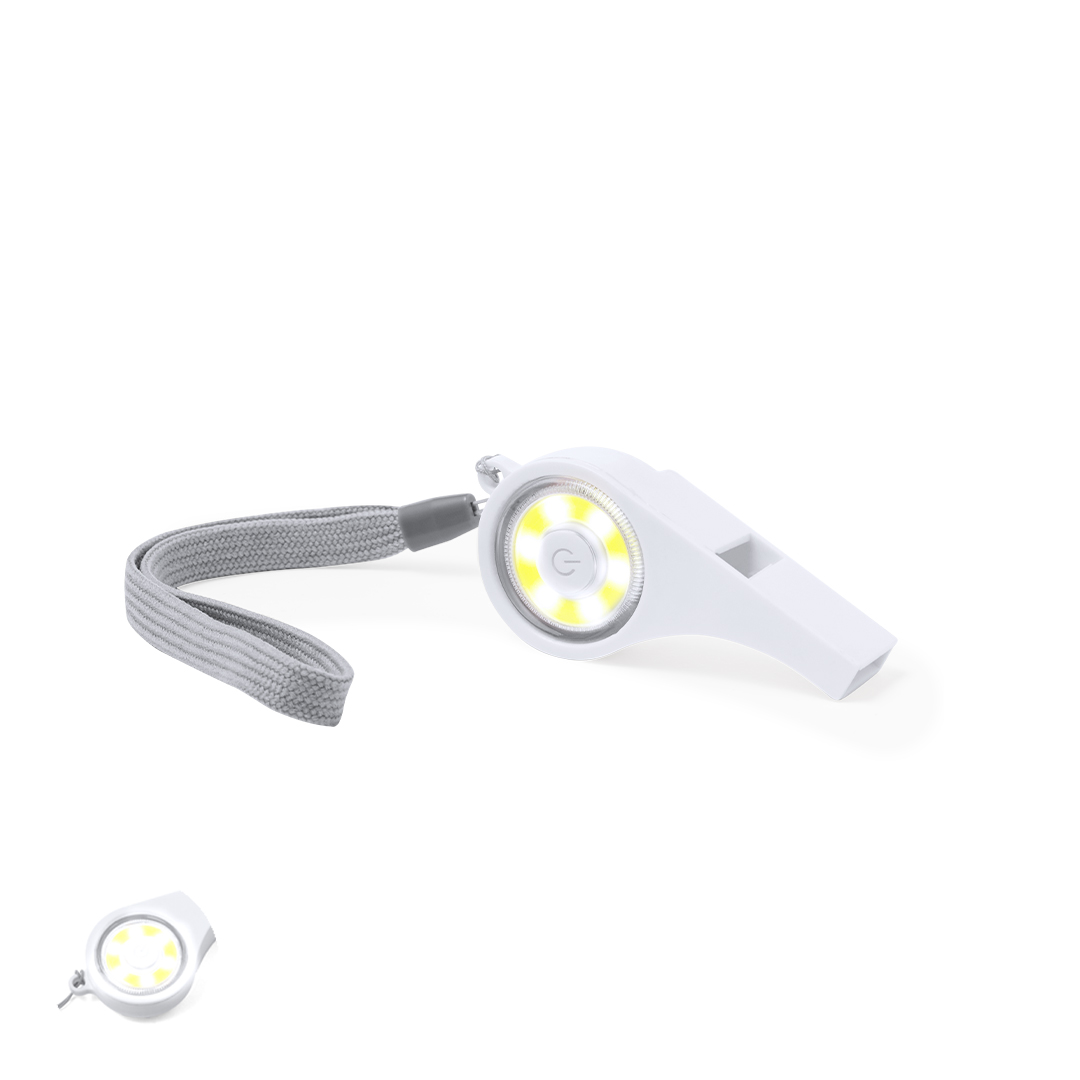Fischietto multiuso realizzato in robusto ABS, dotato di luce integrata con 6 luci COB. Offre diverse posizioni di illuminazione, tra cui fissa con due livelli di intensità e lampeggiante per una maggiore visibilità. Il cordino consente un facile trasporto ed è alimentato da una batteria a bottone inclusa, presentato in una scatola dal design kraft.