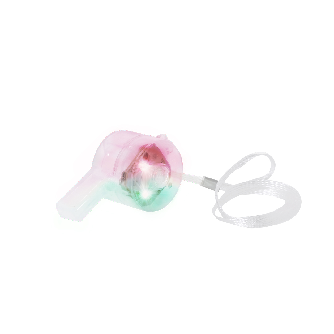 Fischietto luminoso con LED multicolore, progettato per offrire varie posizioni di illuminazione: lampeggio lento, medio o rapido. Include un pratico pulsante di accensione/spegnimento e un cordino per un trasporto comodo. Funziona con tre batterie a pulsante incluse. Questo prodotto è personalizzabile con logo, rendendolo un'ottima scelta per eventi e promozioni.