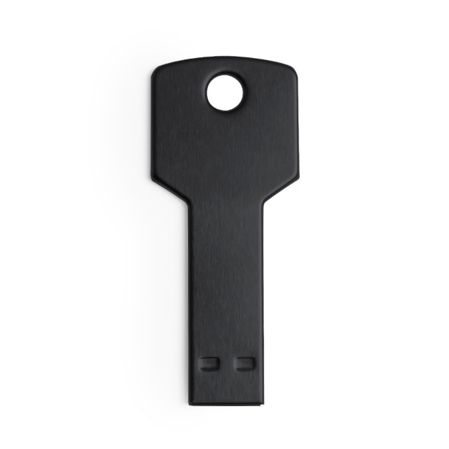 Chiavetta USB da 16 GB a forma di chiave con finitura in alluminio lucido, progettata per essere portata con sé in un portachiavi. Presentata in una custodia individuale in metallo con finestra e morbida schiuma fustellata.