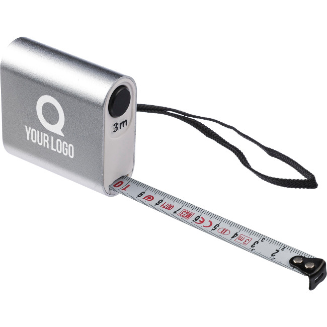 Flessometro in alluminio da 3 metri, pulsante, scala in centimetri incluso cordino da polso, confezionato singolarmente in una scatola in cartone avana