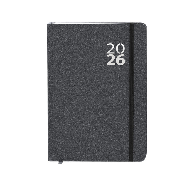 Agenda formato A5 in cartone riciclato, con copertine rigide e chiusura con fascia elastica coordinata. Include una scatola di presentazione in kraft e un logo ECO.Design a pagina giornaliera, con un'area per appunti e segnalibro in tessuto. In 2 lingue: inglese e spagnolo.Il cartone riciclato proviene dal riutilizzo dei surplus di produzione e dal riciclo della carta a fine vita, rendendolo una tela ecologica e sostenibile.