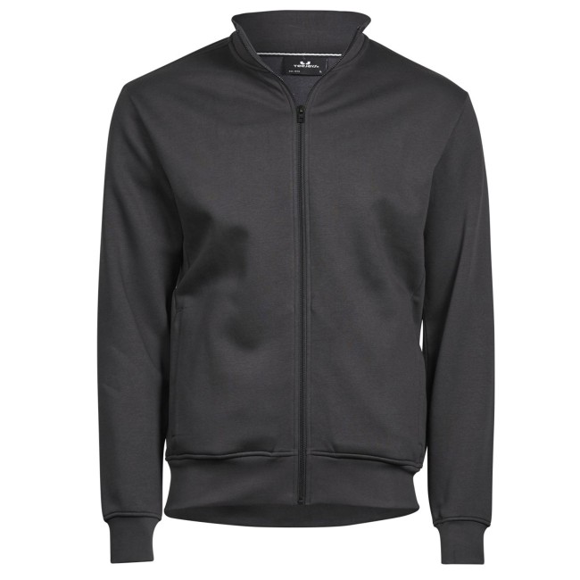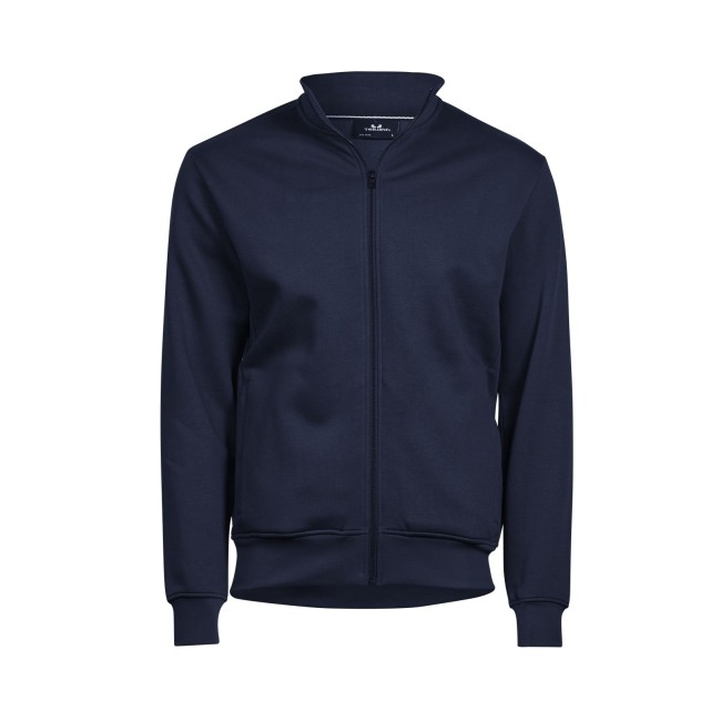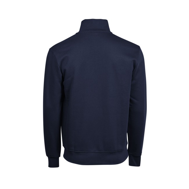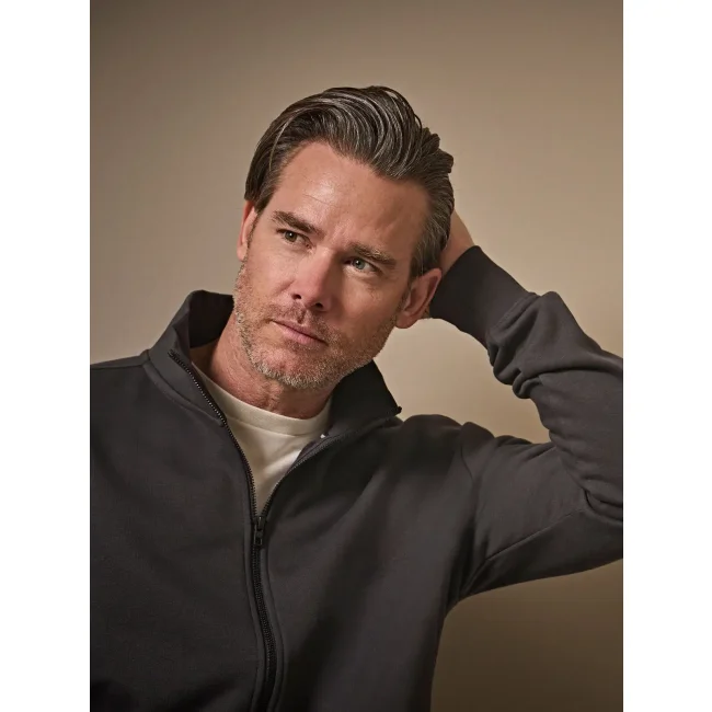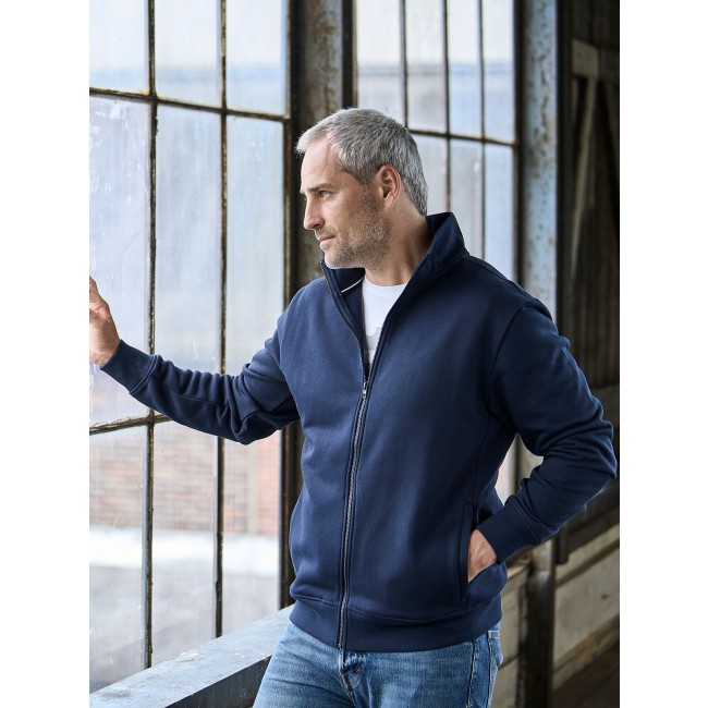 70% cotone 30% poliestere. Felpa zip intera, polsini elastici con cuciture doppie, colletto alto e orlo in costina, due tasche frontali con zip. Tessuto a tre fili, felpato internamente.
