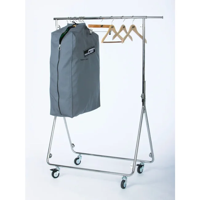 Pratico porta abiti da viaggio per la tua collezione James & Nicholson, resistente cromatura di qualità con 4 ruote e freno, pieghevole, 2 estensioni ogni 30 cm. Dimensioni: 100 x 155 cm.