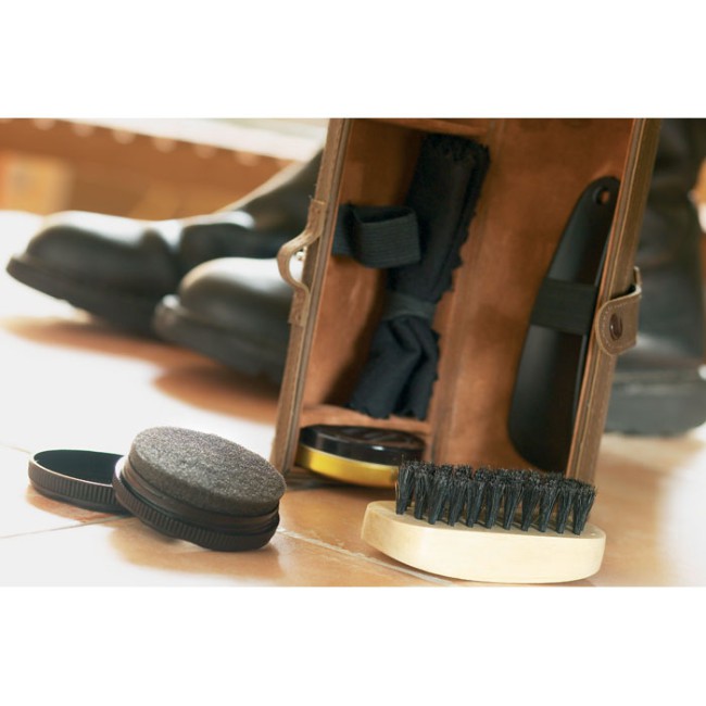 Kit lucida scarpe di lusso da 5 pezzi in confezione regalo. Questo set comprende un panno nero per scarpe, un calza scarpe, una spazzola di legno, una spugna per lucidare e un lucido di colore neutro.