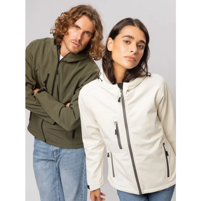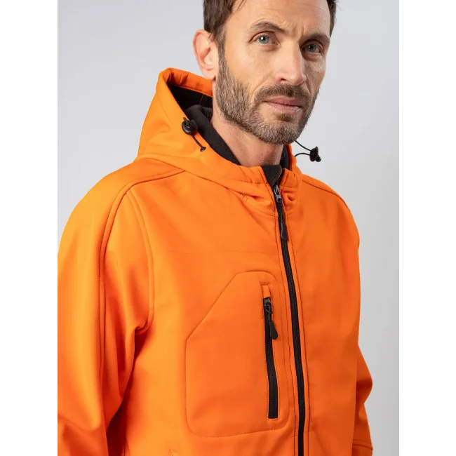 94% poliestere, 6% elastan. Giacca in softshell a 3 strati, cappuccio con fermi in plastica, occhielli e cordino neri. Due tasche laterali con zip, una taschino sul petto con zip, tirazip in plastica, zip interna lato cuore per la personalizzazione, polsini regolabili con velcro, interno in micropile. Bordo inferiore con cordino regolabile con fermi.Impermeabilità 8000 mm, traspirabilità 1000 gr/m2. Etichetta strappabile.