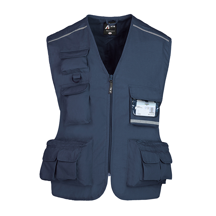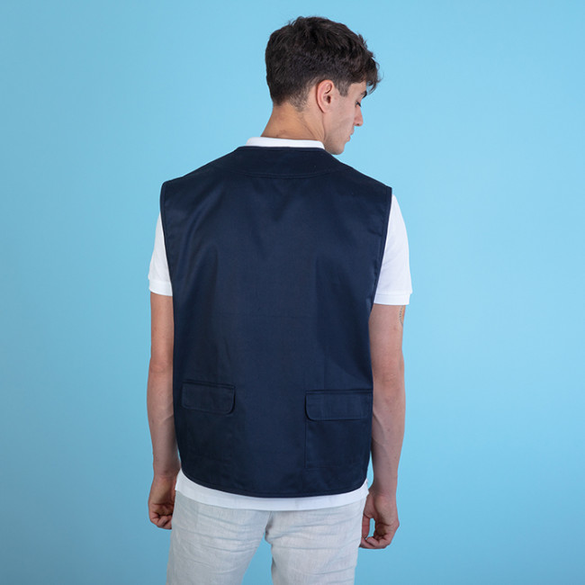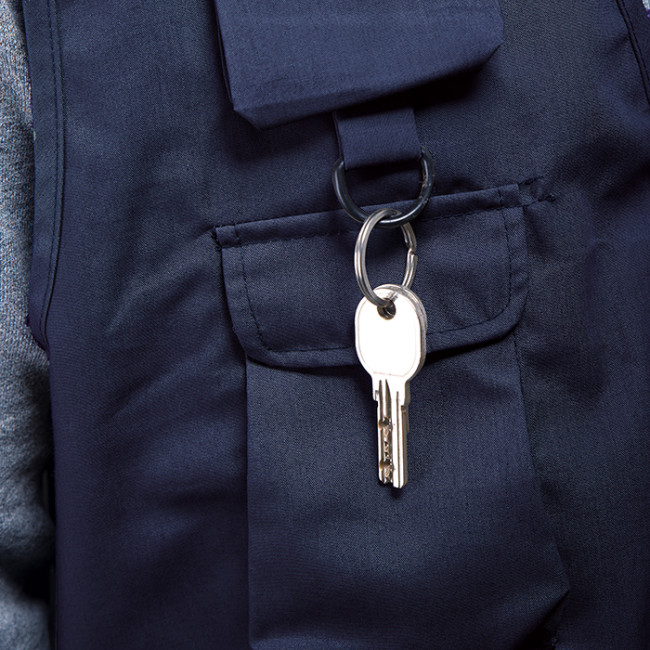 Gilet multitasche in policotton, progettato per offrire praticità e comfort. Dotato di chiusura con zip e fodera interna in tessuto traspirante, è completo di tasca frontale con portabadge a scomparsa e doppia tasca sul retro. Il gancio portachiavi aggiunge ulteriore funzionalità.