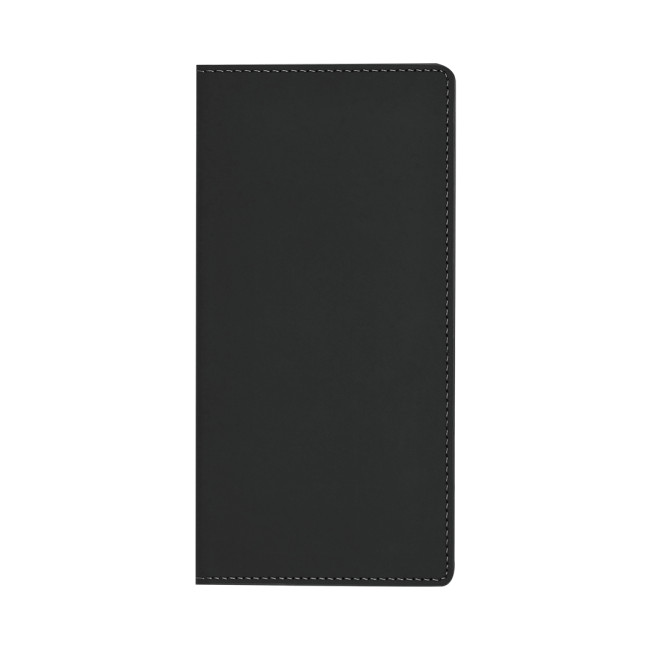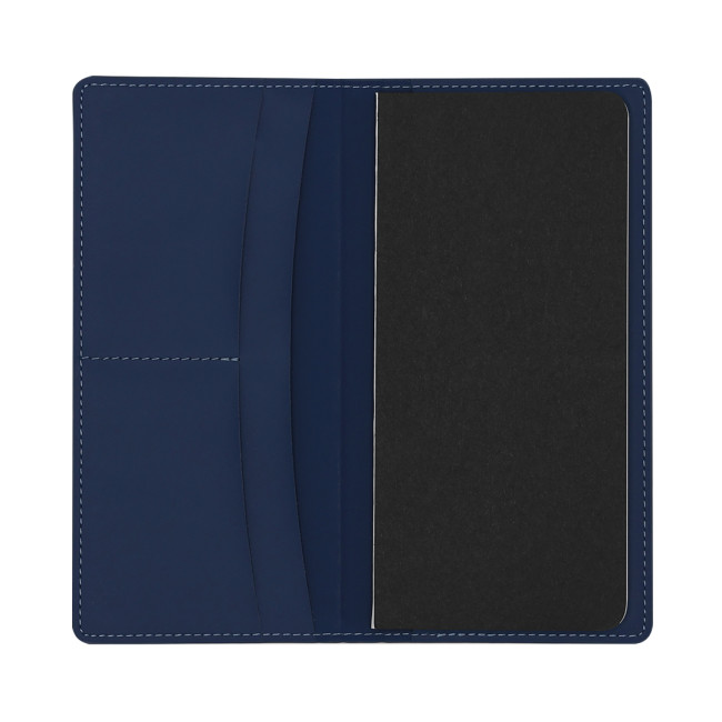 Blocco note con copertine rigide fatte di finta pelle riciclata. Sul retro della copertina include tasche pratiche per lo stoccaggio. Interno con 50 fogli di layout a strisce. Con distintivo in pelle sintetica riciclata.