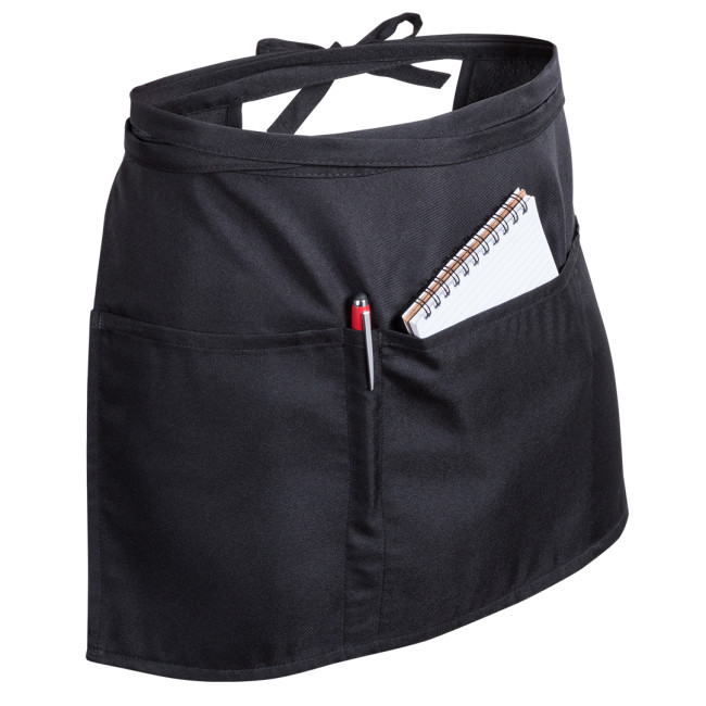 Grembiule in vita realizzato in materiale 100% poliestere, caratterizzato da una finitura morbida e un elegante colore nero. Dotato di 2 tasche grandi e una tasca portapenne, è regolabile con cinghie per una vestibilità personalizzata.