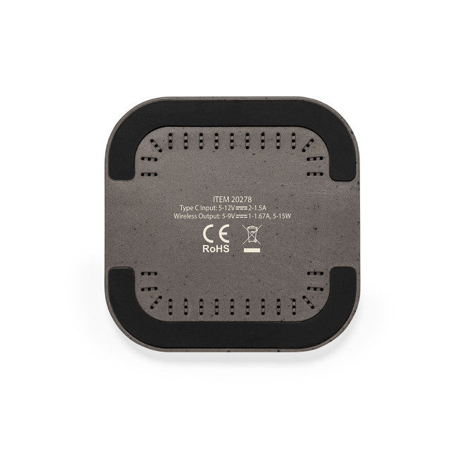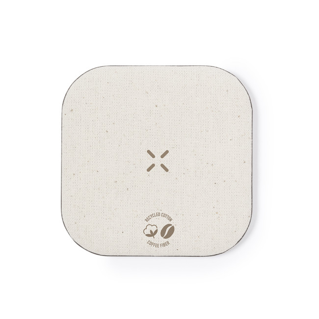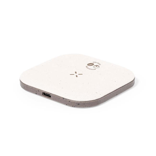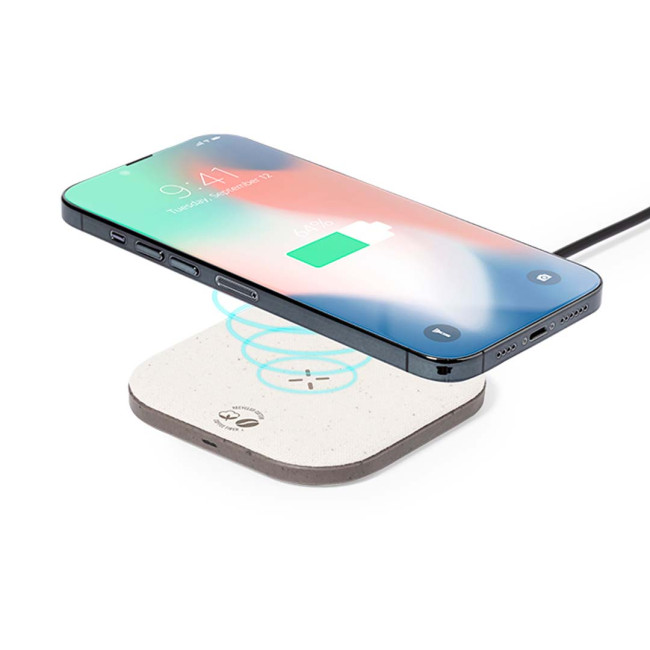Caricatore wireless realizzato in fibra di caffè e cotone riciclato. Base antiscivolo e compatibile con i dispositivi dotati di tecnologia di ricarica Qi. Capacità di ricarica di 15W, con cavo nero di tipo C incluso. Con loghi in fibra di caffè e cotone riciclato. Presentato in un'attraente scatola dal design kraft, con manuale di istruzioni in inglese e spagnolo.La fibra di caffè è una soluzione circolare ottenuta dall'utilizzo degli scarti della produzione del caffè. Un'alternativa sostenibile che favorisce la riduzione dell'uso della plastica, risparmiando energia nel processo di produzione e contribuendo alla cura dell'ambiente.È disponibile la certificazione GRS (Global Recycled Standard), che garantisce l'origine riciclata del materiale utilizzato per la realizzazione del prodotto.