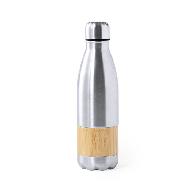 Borraccia della linea Natura, prodotta con una combinazione di acciaio inossidabile opaco e bambù. Capacità di 750ml, con tappo di sicurezza. Confezionata in attraente scatola eco-design.
