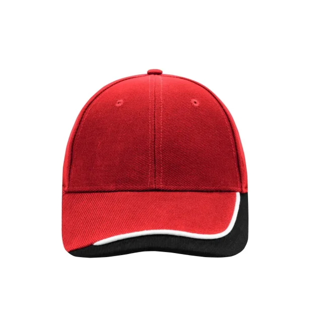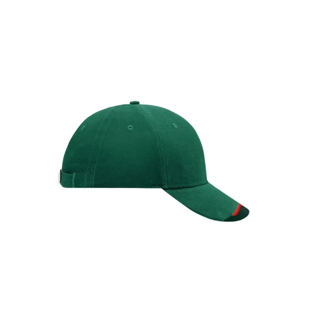 100% cotone. Cappello a 6 pannelli con sandwich in tre colori Visiera sandwich con filetto a costola a contrasto. Pannelli frontali laminati. Fascetta tergisudore imbottita in satin. Chiusura a clip argentata con asola imbastita. Cotone spazzolato forte, ruvido, policromo, Sandwich