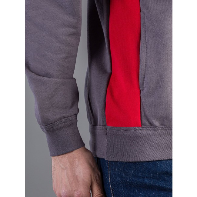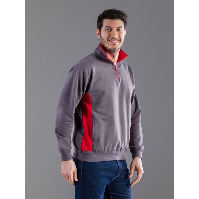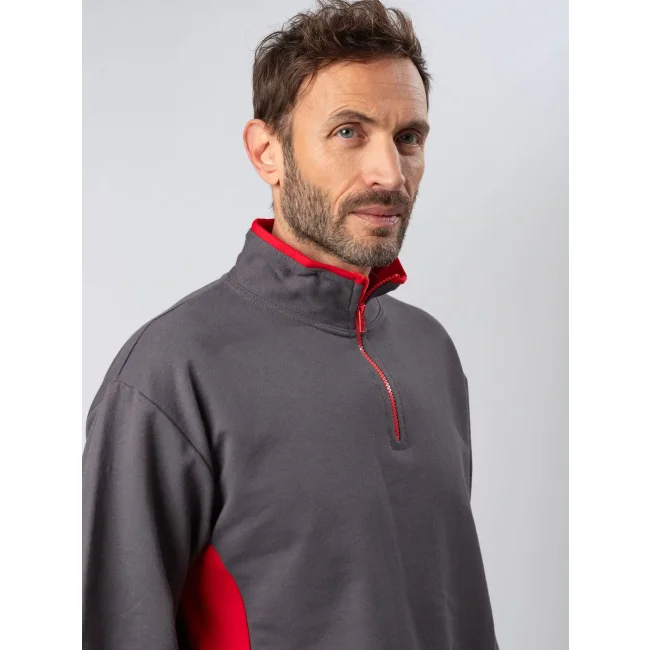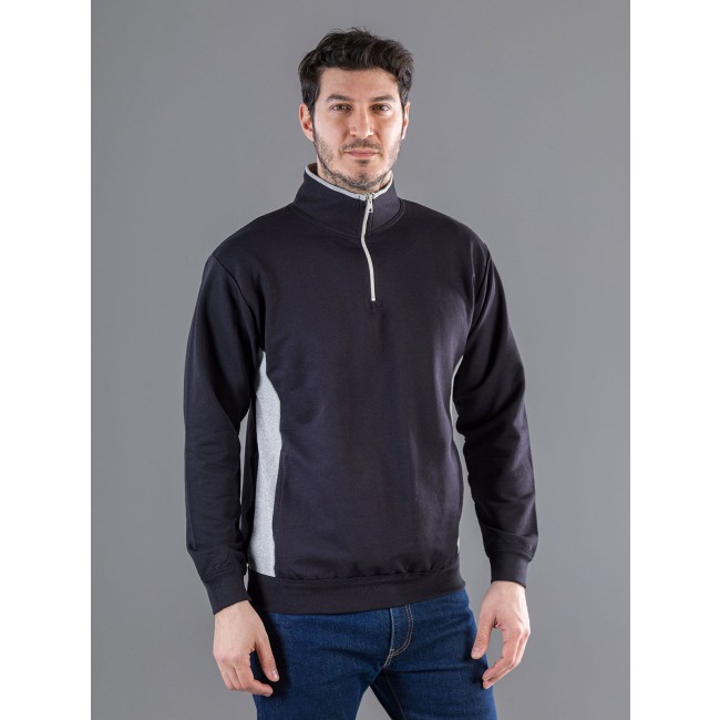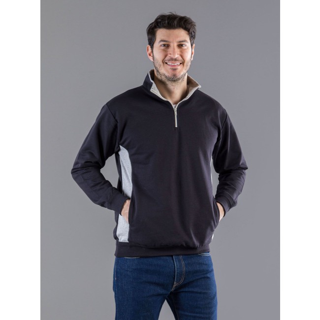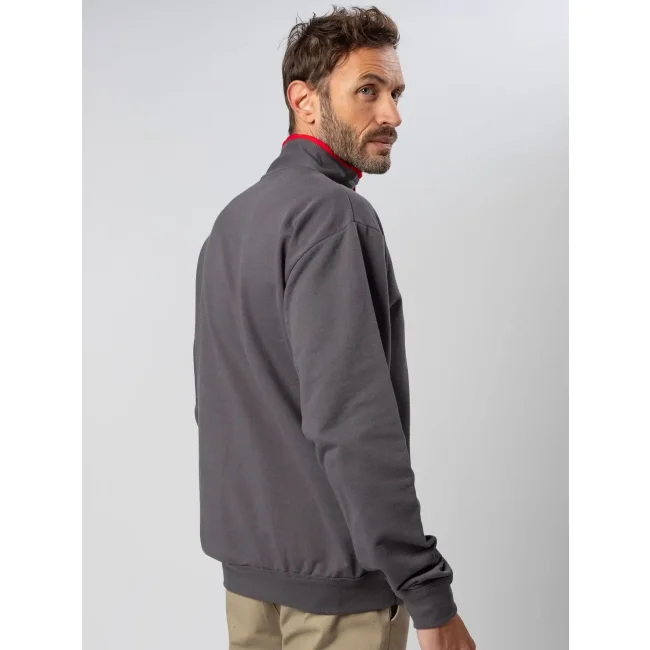 100% cotone. French terry. Felpa mezza zip bicolore parte interna del collo, fianchi, interno tasca e cerniera di colore contrastante. Struttura con cuciture laterali, maniche set-in.
