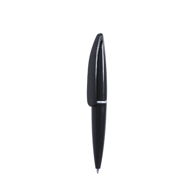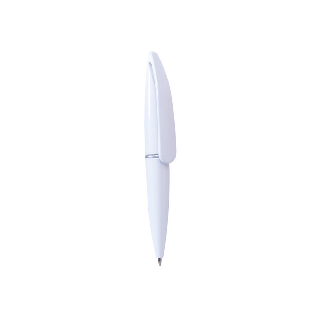 Mini biro con meccanismo a rotazione in colori pieni di grande effetto. Con clip originale di grandi dimensioni e anello centrale color argento. Inchiostro blu.