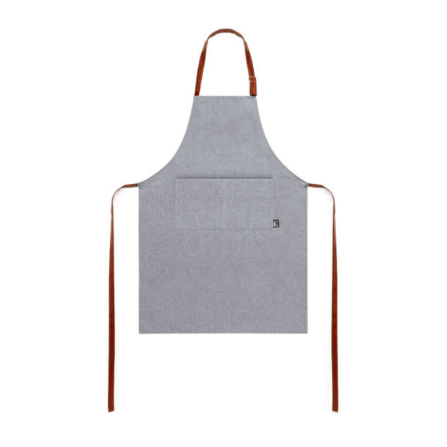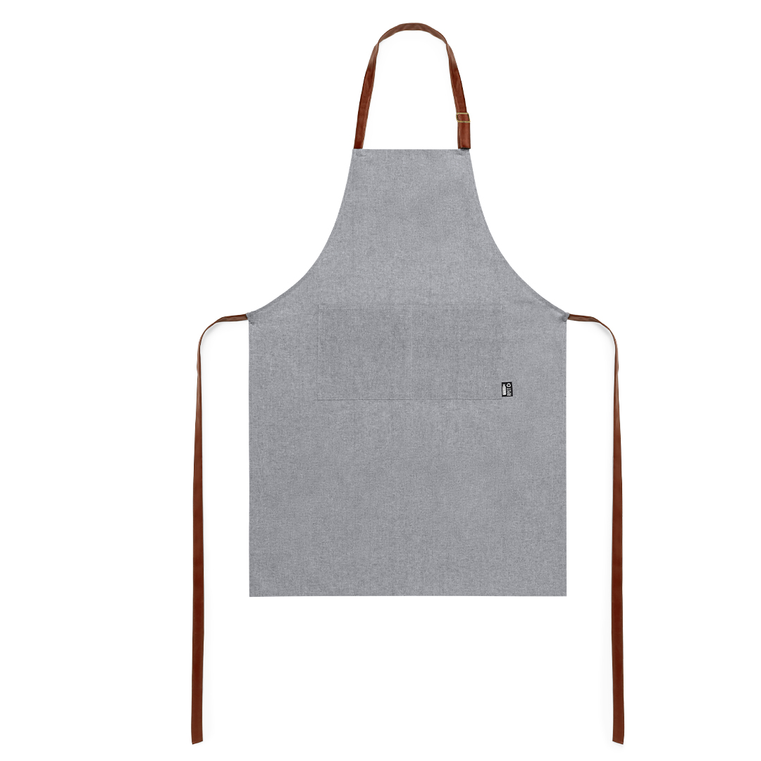 Grembiule della linea natura in materiale RPET, realizzato con plastica riciclata, per promuovere il riutilizzo dei rifiuti plastici e contribuire alla sostenibilità del pianeta. Tagliato sotto il ginocchio, con cinghie di regolazione in resistente similpelle e ampia tasca frontale. Etichetta RPET sulla tasca.