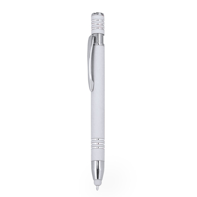 Penna a sfera con meccanismo a pulsante e stilo, realizzata in alluminio. Finitura gommata, appositamente progettata per la marcatura laser, rivelando il logo in tono argento. Accessori placcati in cromo e clip abbinato inclusi. Inchiostro blu.