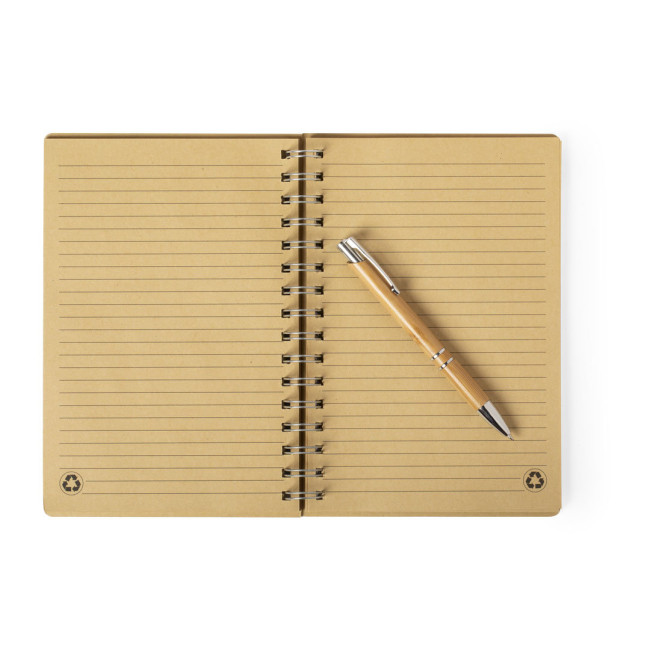 Set di quaderno e penna in linea natura. Include un raccoglitore ad anelli con copertine rigide in bambù, con 80 fogli a disposizione per una striscia ed eco design. Penna a sfera a pulsante, con corpo in bambù e accessori in metallo, cartuccia jumbo e inchiostro nero. Presentato in scatola di cartone fustellata e design ecologico.