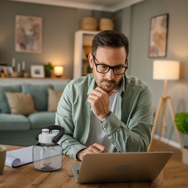 Bottiglia in resistente RPET con capacità di 1,8 L. Con originale forma di kettlebell in colore traslucido lucido. Include chiusura a vite per un'ottima tenuta, cannuccia e robusta maniglia per il trasporto. Priva di BPA. Il materiale RPET è realizzato a partire da plastica riciclata, per promuovere il riutilizzo dei rifiuti plastici e contribuire alla sostenibilità del pianeta.