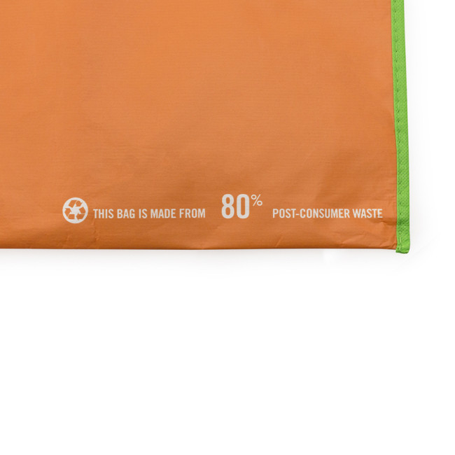 Borsa realizzata in resistente materiale PET riciclato in una gamma di colori vivaci. Con manici lunghi 60 cm di colore verde e rinforzati in nylon. Finitura cucita e resistente fino a 12 kg di peso.