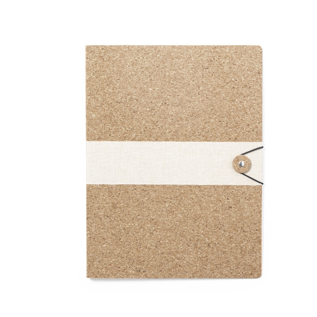 Cartella della linea natura con esterno in sughero naturale e fascia centrale in lino con finitura ecrù. Chiusura elastica.