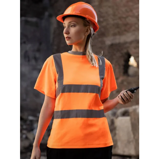 55% cotone, 45% poliestere. 180 g/m². T-Shirt ad alta visibilità, pregiato tessuto traforato di altissima qualità. Due fasce riflettenti larghe 5 cm su busto e spalle. Esterno in poliestere, interno in cotone. Durata delle proprietà riflettenti in conformità alla normativa EN per 25 cicli di lavaggio a 40°C. Confezionata singolarmente in una pratica borsa in polietilene. Prodotto certificato EN ISO 20471: 2013 / A1: 2016. RIS-3279-TOM Iss 2 (Orange). Materiali: Oeko-Tex®100 Standard.