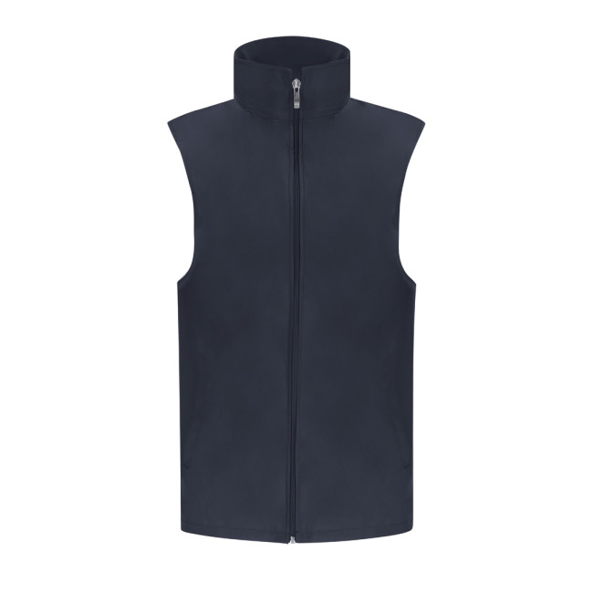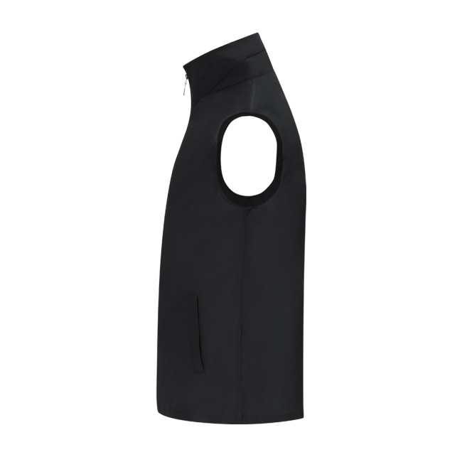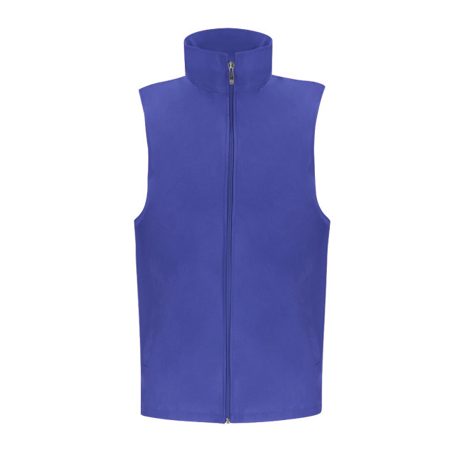 Gilet unisex in tessuto leggero e traspirante con fodera in rete bianca. Zip frontale coordinato e tirazip argentato, con una tasca esterna su ogni lato.