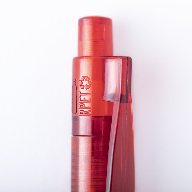 Penna della linea Nature in RPET, realizzata in plastica riciclata per favorire il riutilizzo dei rifiuti plastici e aiutare la sostenibilità del pianeta. Finitura traslucida e clip originale, con il logo RPET sul corpo della penna e disponibile in un'ampia gamma di colori. Appositamente progettata per la stampa in tampografia, con meccanismo push e refill blu.