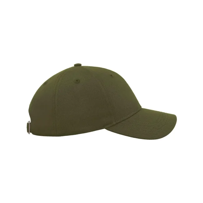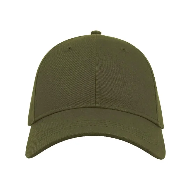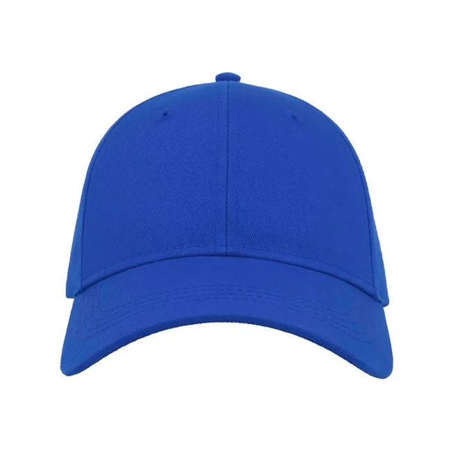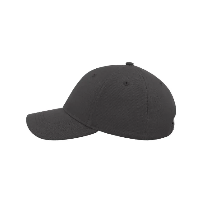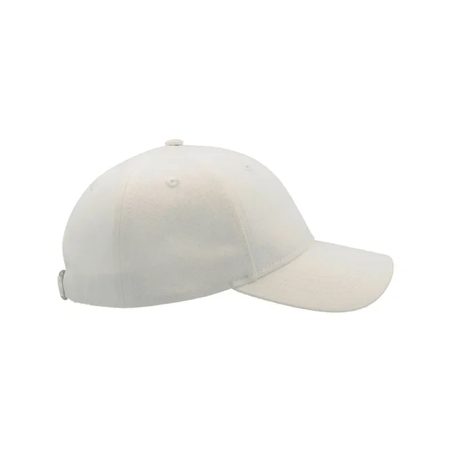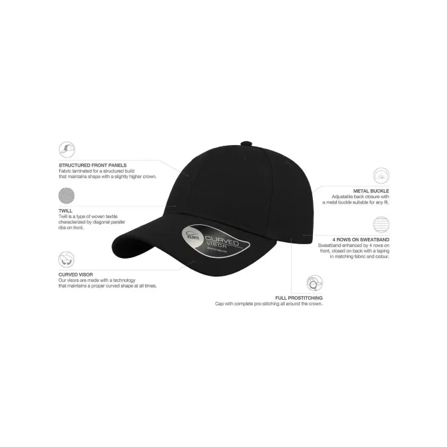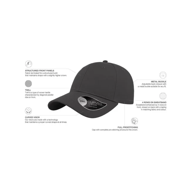 100% cotone. Cappellino a 6 pannelli con visiera ricurva, occhielli ricamati, 8 cuciture sulla visiera, etichetta strappabile, taglia unica.
