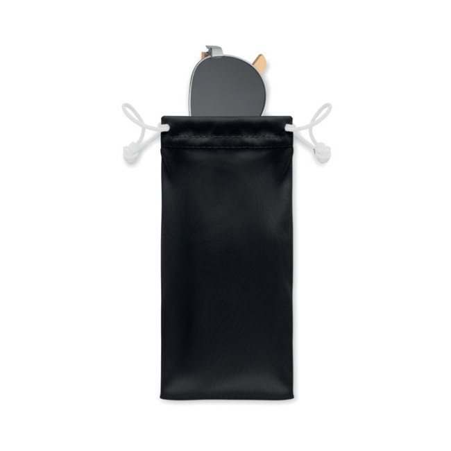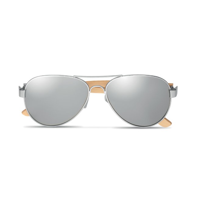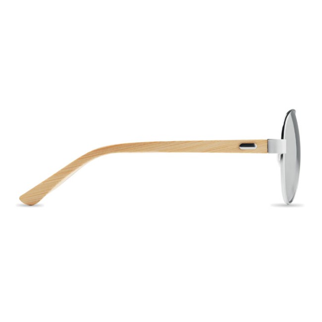 Occhiali da sole con stanghette di bambù e lenti colorate a specchio. Questi classici occhiali da sole hanno una forma retrò combinata con un prodotto naturale per creare un articolo estivo spettacolare. Gli occhiali sono forniti in un sacchetto di microfibra. Hanno una protezione UV400 e possono quindi essere utilizzati per le attività quotidiane quando il sole è fuori. Il bambù è un prodotto naturale, ci possono essere leggere variazioni di colore e dimensioni per ogni articolo, che possono influenzare il risultato finale della personalizzazione.