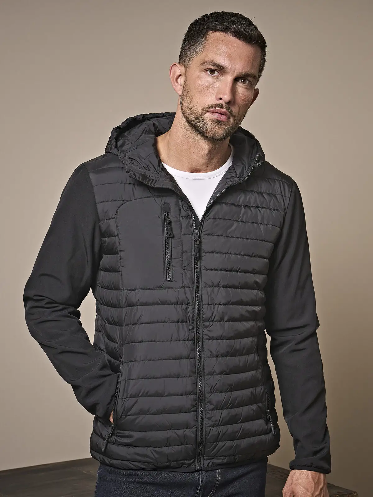 100% poliestere 300t. Giacca con maniche in softshell: 95% poliestere e 5% elastane, 2 ampie tasche frontali, una tasca interna, taschino al petto, cerniere, cappuccio regolabile, polsini elastici.
