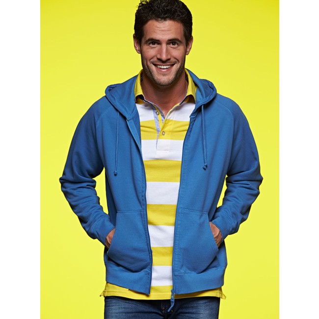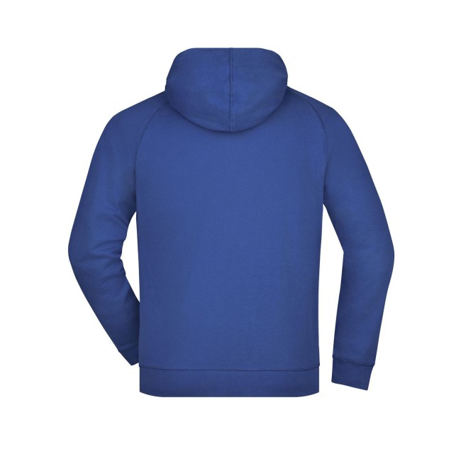 100% cotone. Giacca classica con cappuccio, French terry di alta qualità, sgarzata. Taglio raglan, Bordino con elastan, necktape, Cappuccio a doppio strato con fodera in jersey e cordino, Cuciture doppie sulle maniche e sul bordino, Tasca a marsupio. Tessuto esterno (300 g/m²).