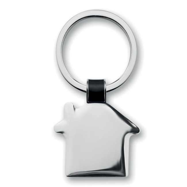 Portachiavi a forma di casa in metallo rivestito di nickel lucido.