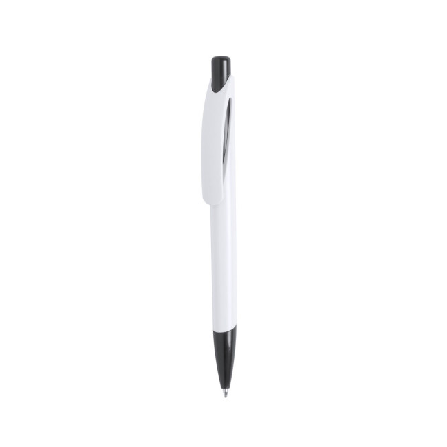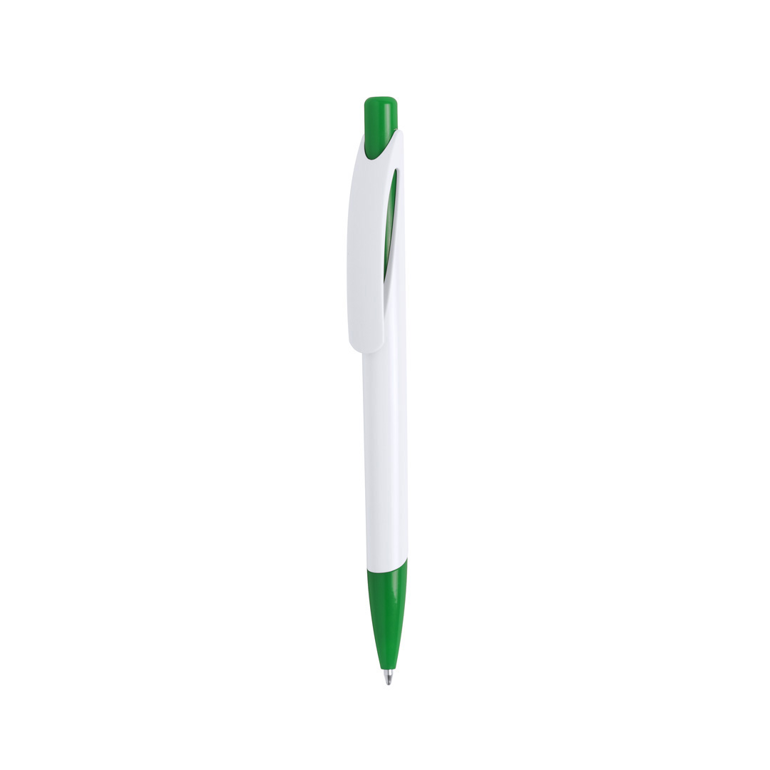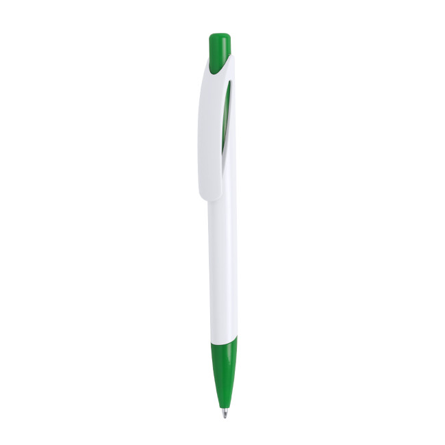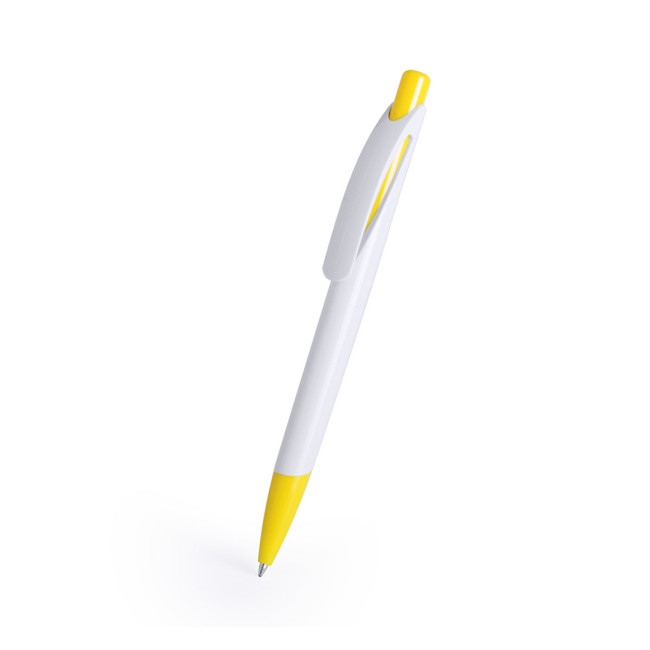 Penna a pulsante bicolore con elementi in tinta unita e fusto bianco liscio. Con originale clip curva e punta coordinata. Inchiostro blu