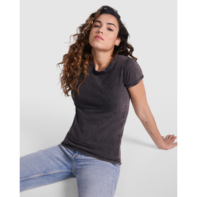 T-shirt manica corta effetto jeans per donna. Girocollo in costina 1x1, con copri cuciture rinforzate da spalla a spalla. Doppia cucitura sul giromanica. Manica con orlo.