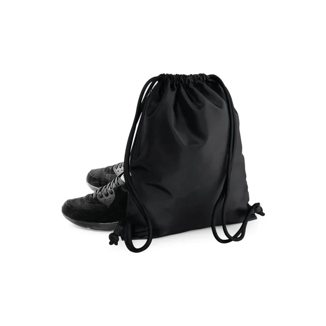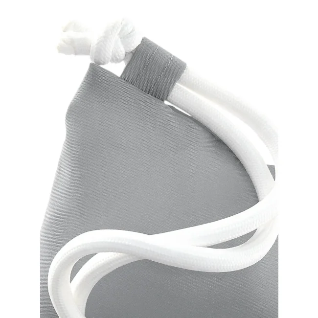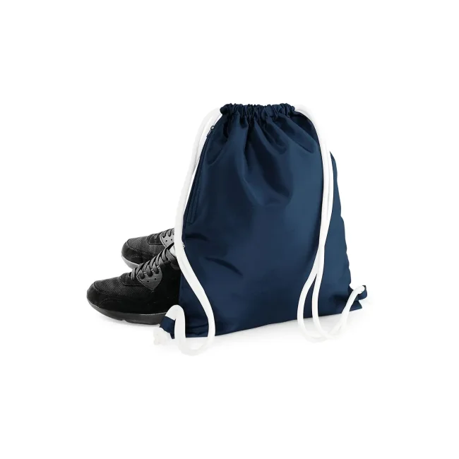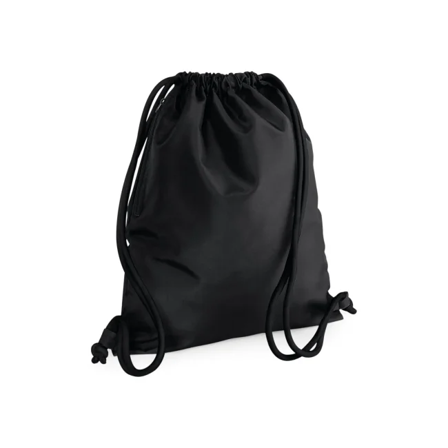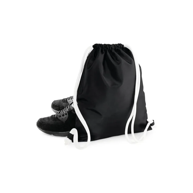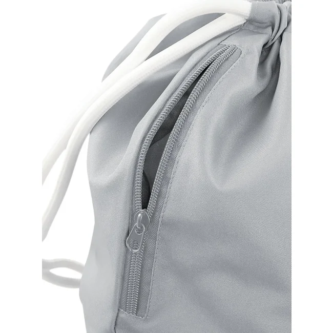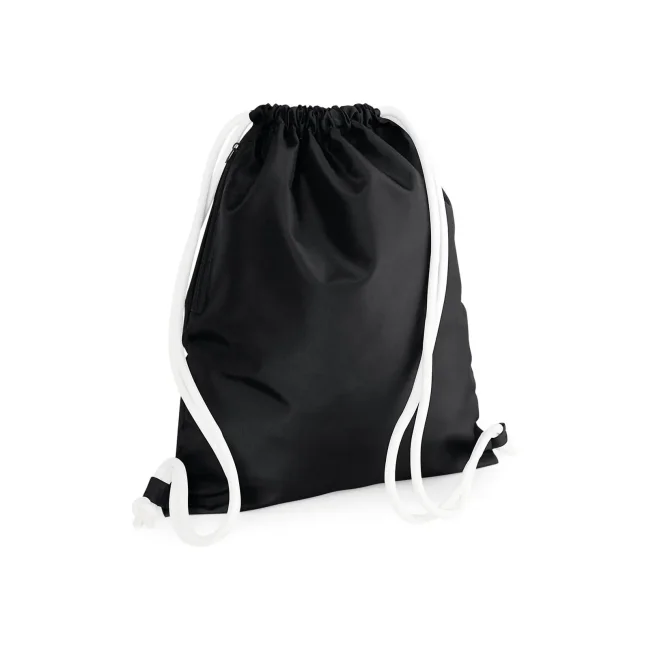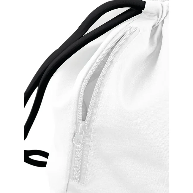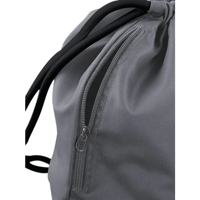 100% poliestere 300d. Sacca con tasca interna laterale con cerniera, cordoncini spessi Dimensioni: 40 x 49 cm, capacita' 15 litri, area stampabile: 36 x 42 cm.