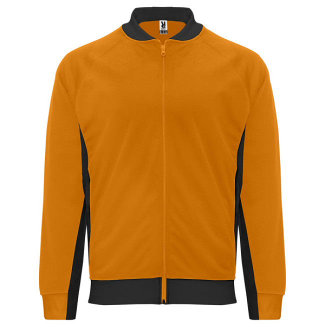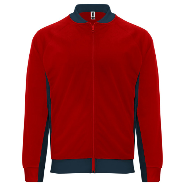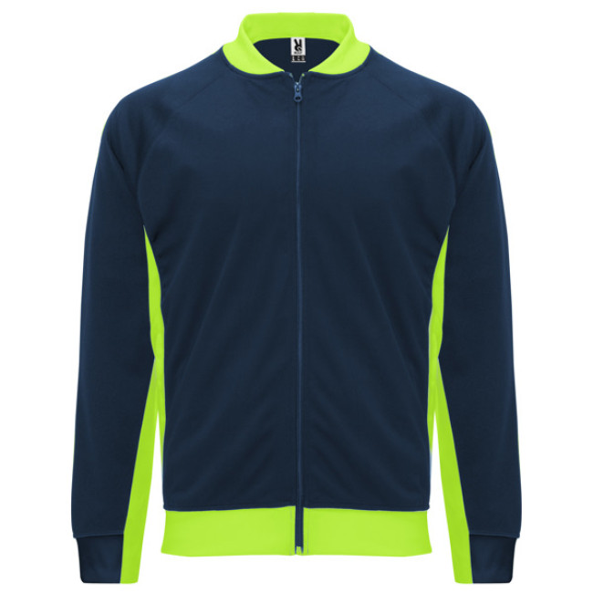 Giacca sportiva.1. Manica raglan.2. Pannelli in contrasto nei laterali e maniche.3. Collo, polsini e girovita in costina 2x1.4. Due tasche laterali con cerniera.5. Rivestimento interno di retina in contrasto.