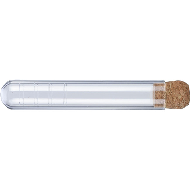 Infusore per tè in vetro borosilicato, tappo in sughero, dispone di 8 aperture per l'infusione del tè in acqua calda, confezionato singolarmente in una scatola in cartone avana con all'interno una busta protettiva a bolle d'aria