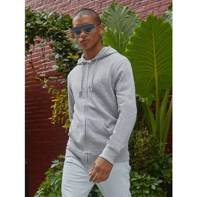 80% Cotone ring-spun organico o organico in-conversion, pettinato, preristretto, 20% Poliestere riciclato RCS. Felpa con cappuccio foderato in jersey e cerniera, struttura con cuciture laterali, nastro parasudore a spina di pesce, mezzaluna in single Jersey sulla schiena per una facile personalizzazione. Sgarzata internamente, esterno 100% cotone molto liscio e morbido. Nessuna etichetta B&C.