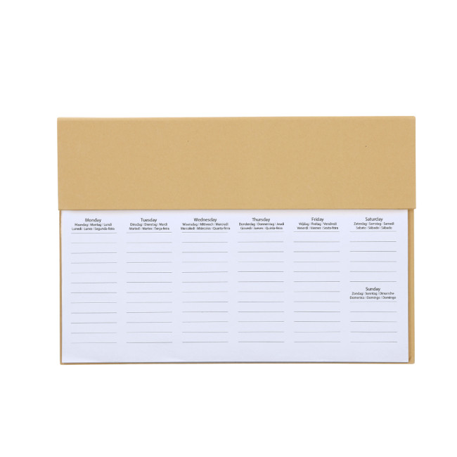 Planner settimanale da scrivania disponibile in 7 lingue (spagnolo, inglese, francese, portoghese, tedesco, olandese, italiano). Include 125 fogli per la pianificazione settimanale, 25 note adesive medie e 100 mini-note adesive in colori assortiti, penna a pressione con corpo in cartone riciclato e inchiostro blu, righello in legno, copertina rigida in cartone riciclato e foglio protettivo in plastica. Il cartone riciclato proviene dal riutilizzo di eccedenze di produzione e dal riciclo della carta a fine vita, trasformandosi in una tela ecologica e sostenibile.