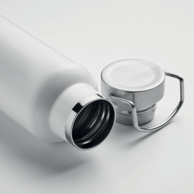 Bottiglia a doppio strato isolata sottovuoto in acciaio inox riciclato con coperchio a maniglia e base con dettagli in sughero. Senza perdite. Capacità: 500 ml. (90% acciaio inox riciclato e 10% acciaio inox).