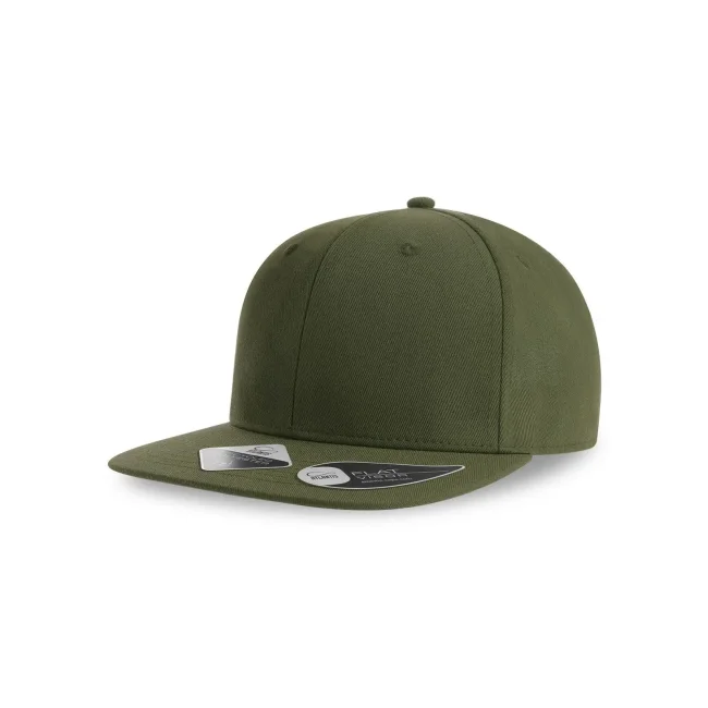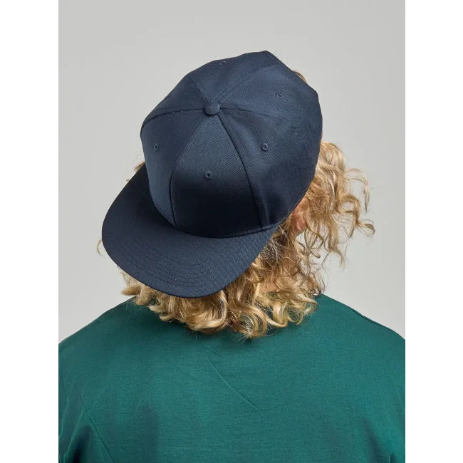 100% poliestere twill riciclato certificato. Cappellino a 6 pannelli con cuciture in tinta e chiusura snapback in pvc. Linee old school e visiera piatta, etichetta removibile.
