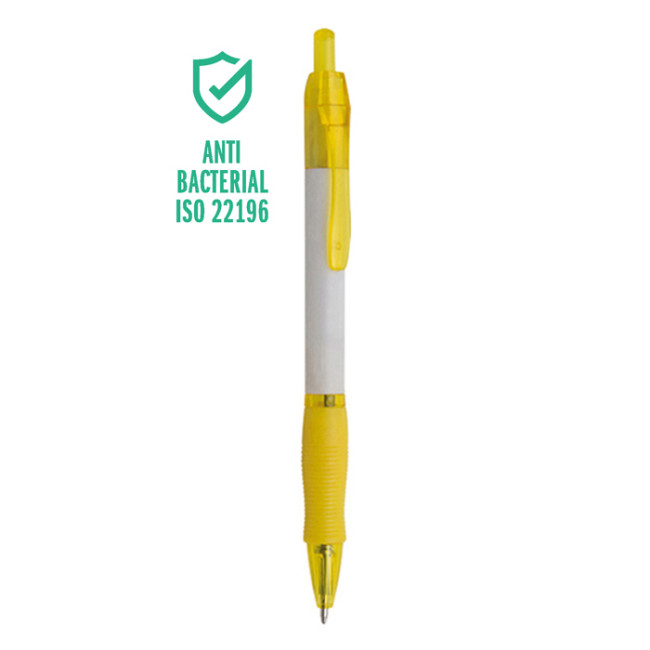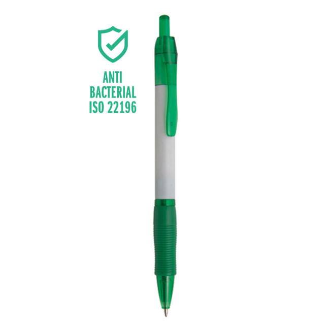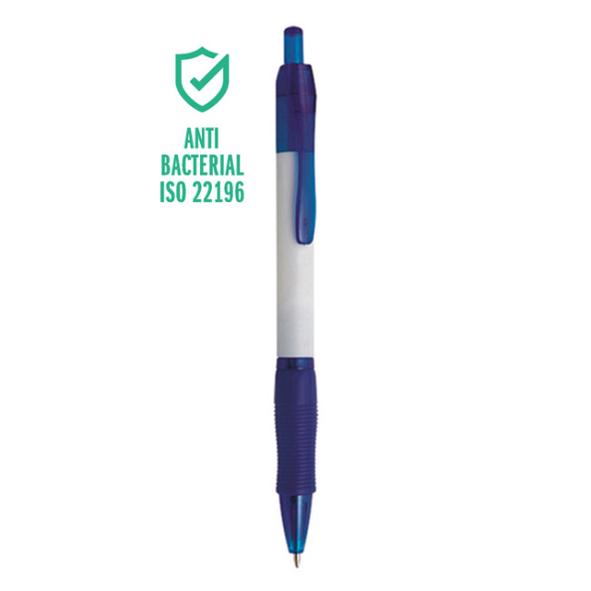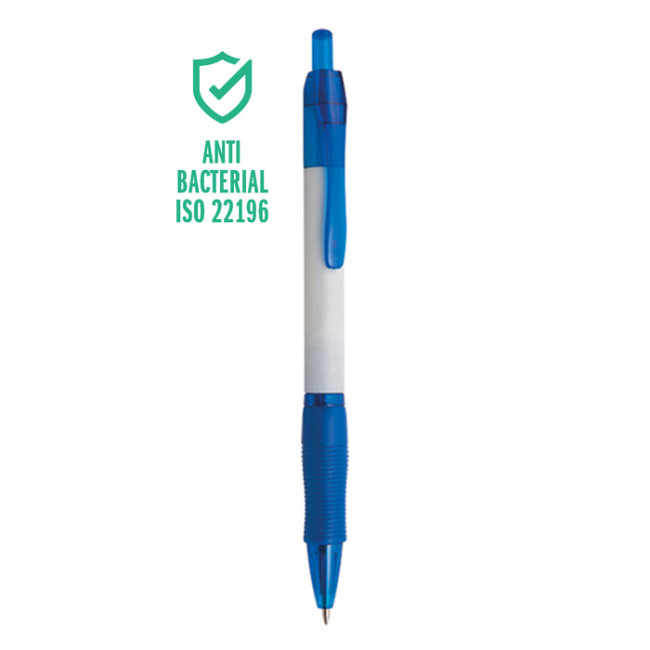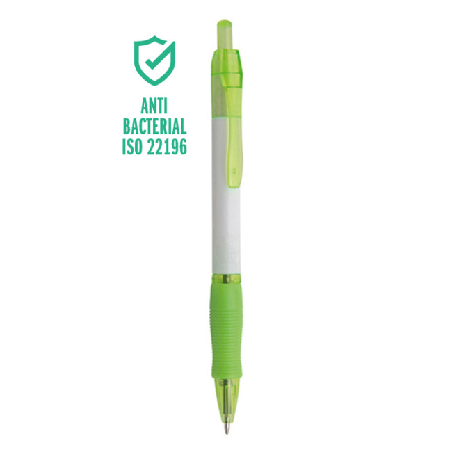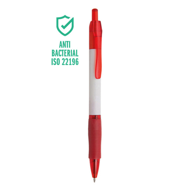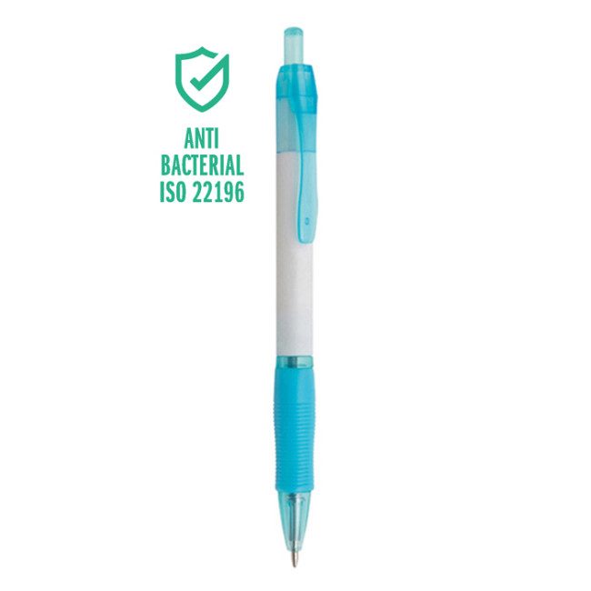 penna a sfera meccanismo a scatto corpo in plastica bianca grip colorata in gomma clip e minuterie in plastica trasparente colorata refill con sfera al tungsteno inchiostro nero tecnica di stampa consigliata: serigrafica - tampografica - UV