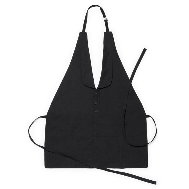 Elegante grembiule con bottoni come decorazione in materiale 100% poliestere. Con laccetto al collo e cinghie in vita regolabili.