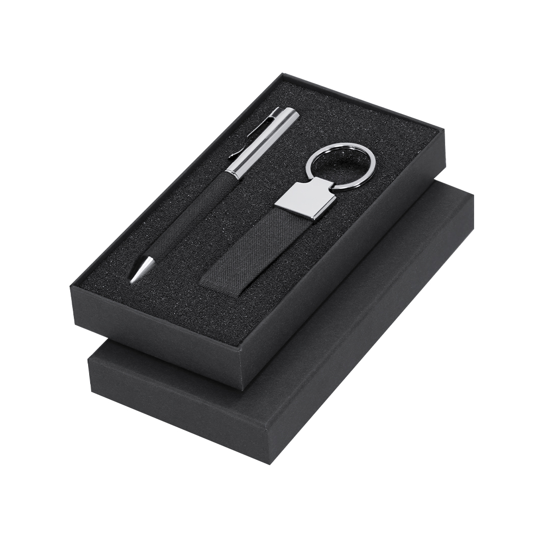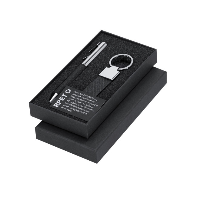 Elegante set in RPET con finitura nera bicolore e dettagli metallici. Include:-Penna a sfera in RPET di finitura nera bicolore e dettagli metallici. Con meccanismo girevole e inchiostro blu.-Portachiavi in RPET di finitura color nero bicolore e accessori cromati.Presentato in astuccio individuale nero. Include scheda nera interna con distintivo RPET.Il materiale RPET è realizzato a partire da plastica riciclata, per promuovere il riutilizzo dei rifiuti plastici e aiutare la sostenibilità del pianeta.