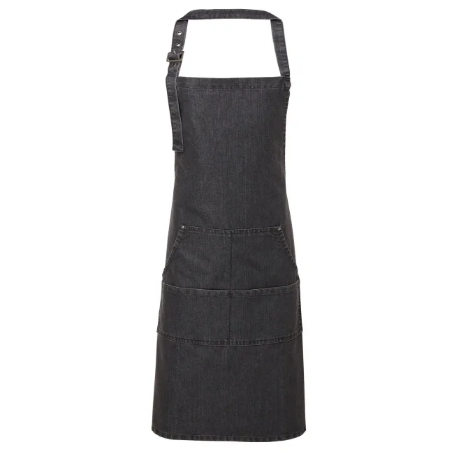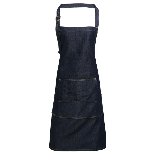 70% cotone 30% twill di poliestere. Grembiule in denim, cuciture a contrasto, inserti in rame, quattro tasche, fibbia per regolare il collo. Lavabile a 60°C. Cordoni in vita: 92 cm l'uno.
