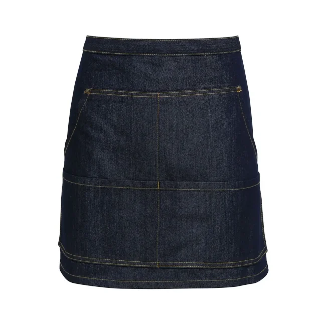 70% cotone, 30% twill di poliestere. Grembiule in denim stile bar, cuciture a contrasto, inserti in rame, quattro tasche, cordino per chiusura (106 cm). Lavabile a 60°C.